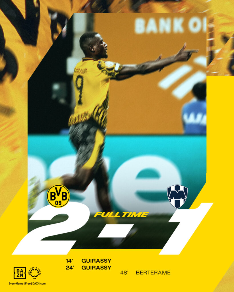 Guirassy tuvo dos oportunidades para sellar la goleada, pero Andrada achicó los servicios del delantero guineano. Por su parte, Monterrey intentó con disparos de Jesús Corona y Nelson Deossa que terminaron en las manos de Gregor Kobel. Al medio tiempo, el marcador parcial era 2-0.